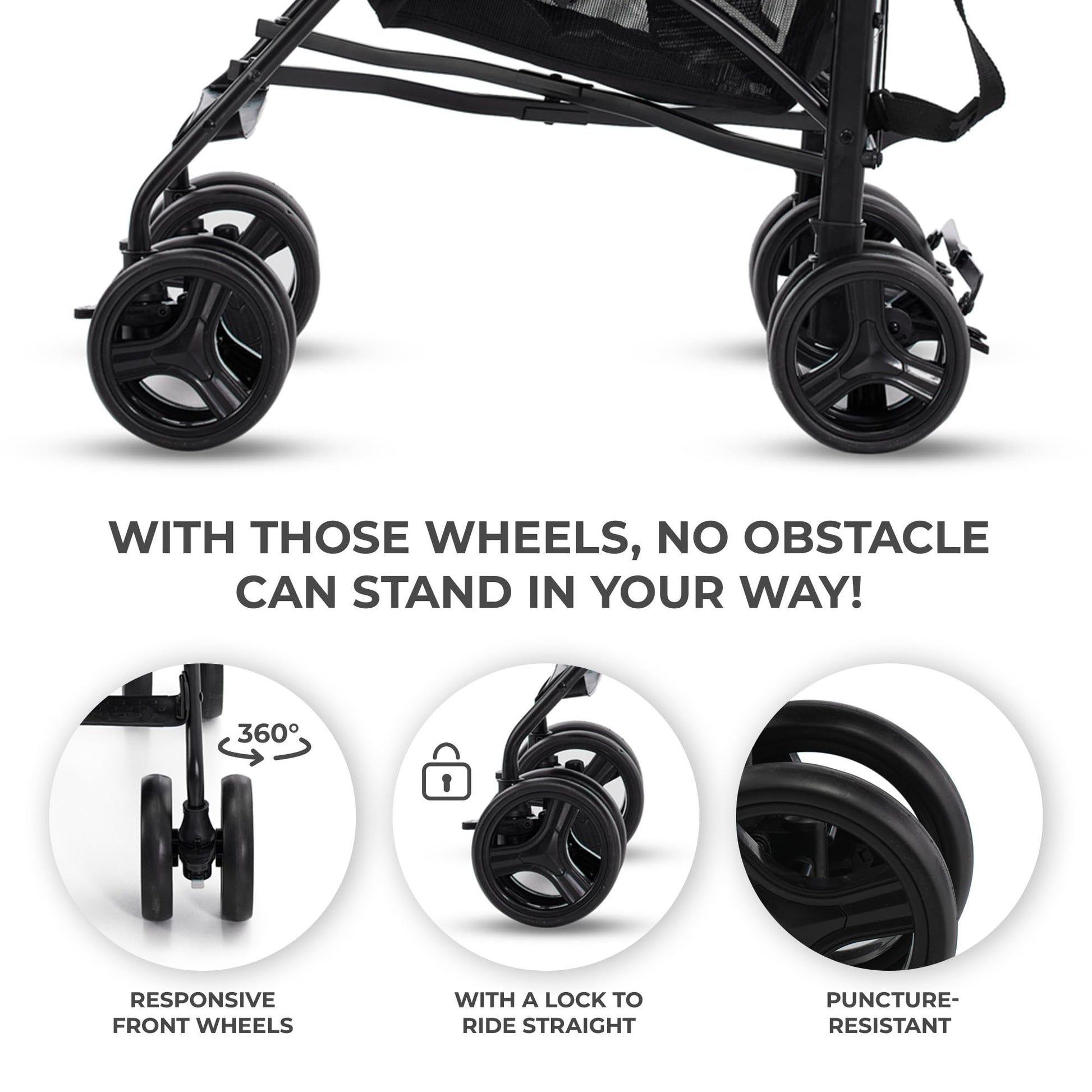- PRACTICAL: the wheels are made of puncture-resistant foam. The front wheels rotate 360 degrees and have a lock to ride straight. The wheels are cushioned, making them suitable for uneven sidewalks