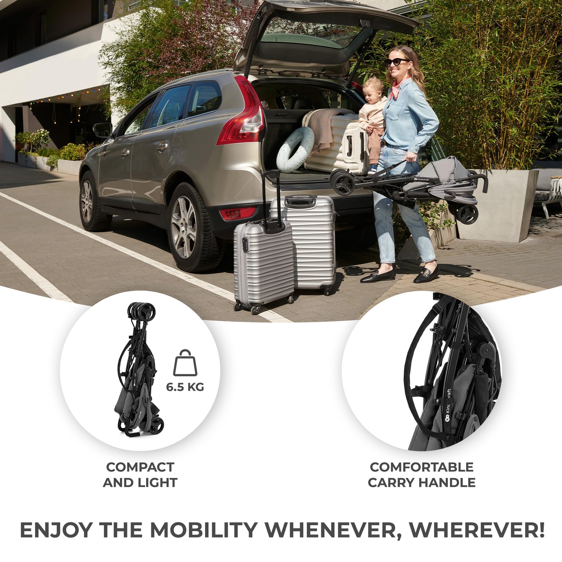 - FUNCTIONAL: the simple folding mechanism and low weight (6.5 kg) make this stroller an ideal pushchair for travelling. It is enough to fold it, so it can fit in the car trunk or behind the wardrobe in a hallway. The expandable hood has a hidden window for contacting the child and protects this little one from wind and sun